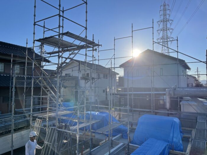 2022.10.21 現場日記 M様邸足場工事 TOP新着情報現場日記M様邸足場工事 今回はL型の建物で屋根勾配も強く、庇の出も大きかったので足場工事に立ち会い階段の位置も含めて入念に考えて施工しました。 前の記事 2022.10.21 M様邸土台伏せ工事 次の記事 2022.10.23 M様邸上棟