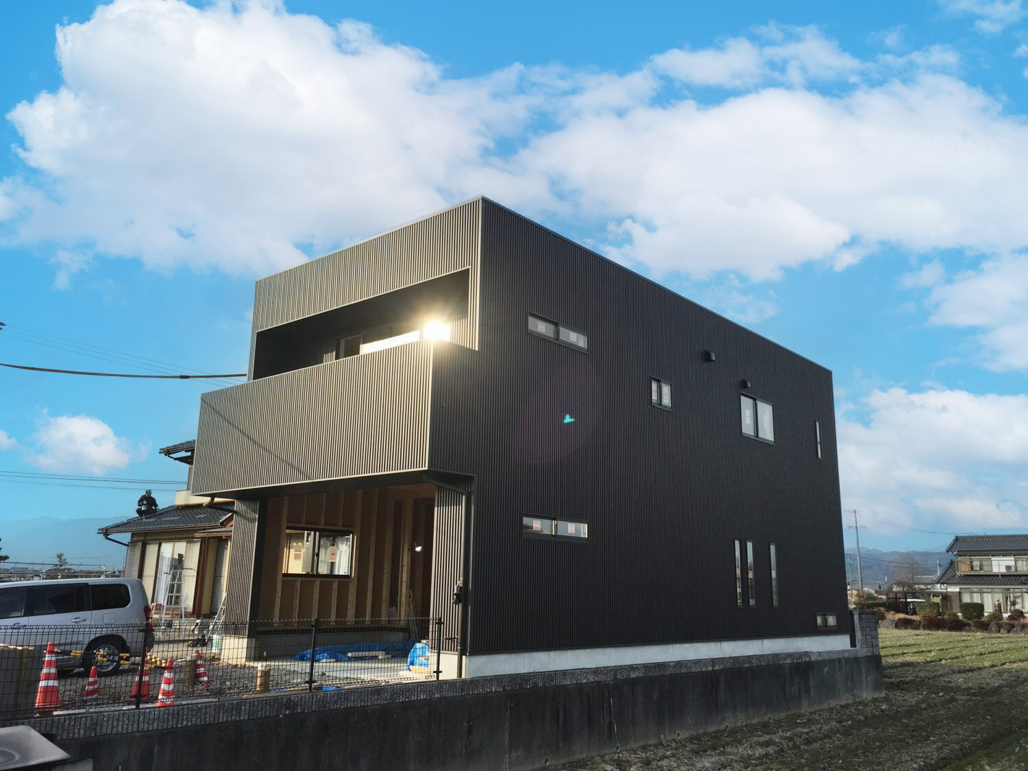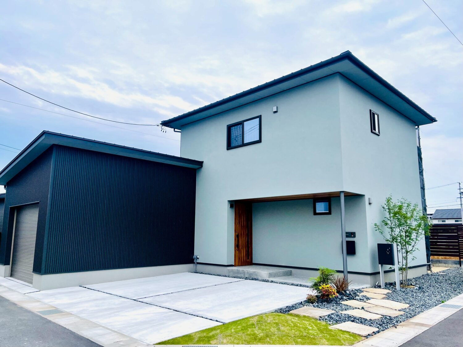 黒のガルバリウムが映えるキューブ型のガレージ併設住宅